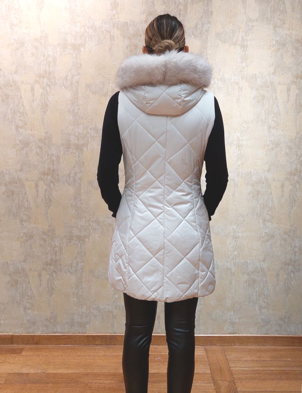 Αμάνικο μπουφάν με γούνα οικολογική και καπιτονέ ύφασμα, σε άσπρο χρώμα.