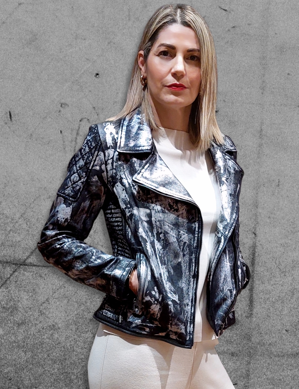 Biker γυναικείο δερμάτινο, σταυρωτό σε ασημί/μαύρο χρώμα