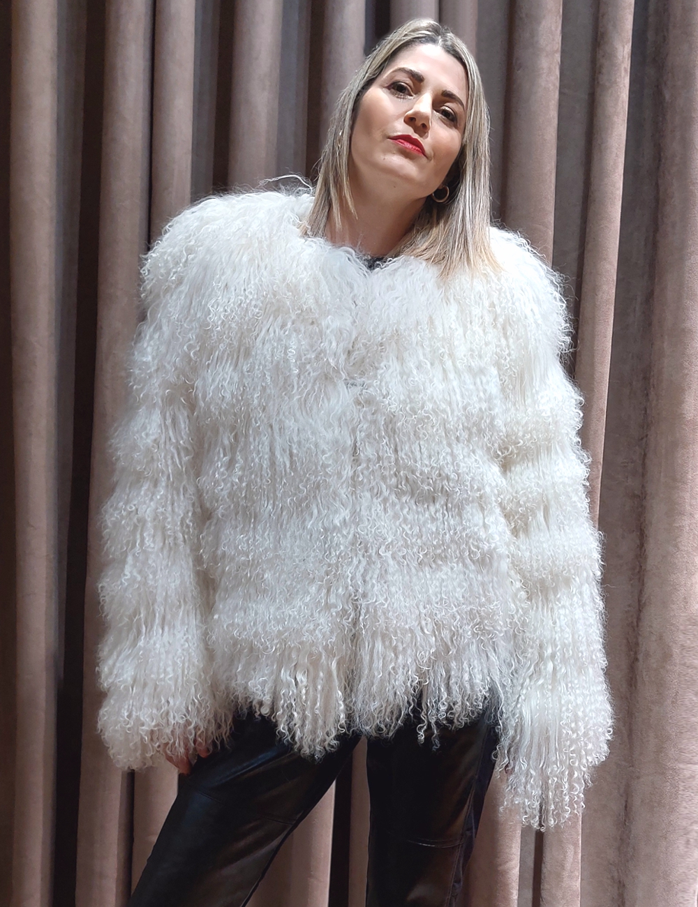 Γούνα Mogolian λευκή, απαλή και εντυπωσιακή, μπορεί να φορεθεί άνετα όλες τις ώρες.