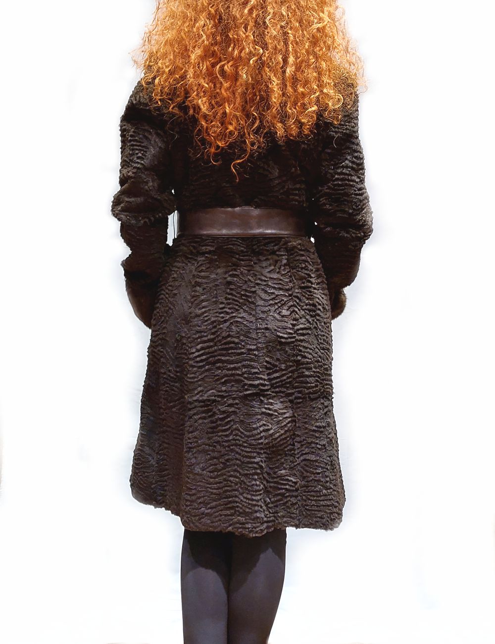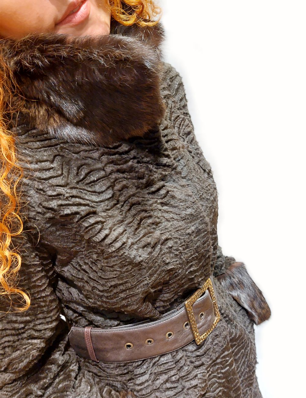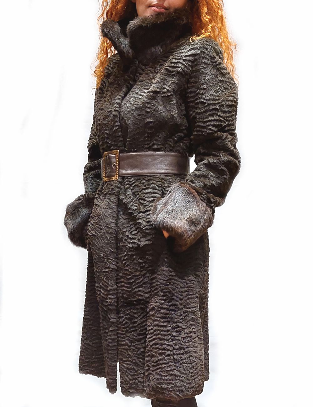 Γούνα παλτό από Lapin σε καφέ χρώμα , όρθιο γιακά και δερμάτινη ζώνη