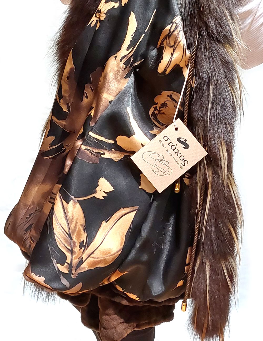 Γούνα Vison σε καφέ σκούρο χρώμα, με Fox γιακά και μόστρα σε καφέ και μπεζ extensions . Είναι μεσάτη και κλείνει με κορδόνια