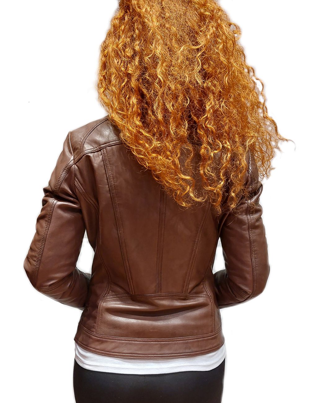 Γυναικείο δερμάτινο καφέ, με κλασικό γιακαδάκι που τσαλακώνει αν θέλετε . Διαθέτει πλαϊνές τσέπες με φερμουάρ, είναι μεσάτο με στενή γραμμή.