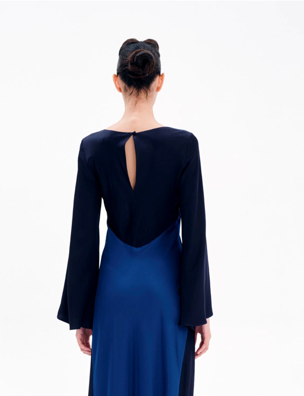 Δίχρωμο φόρεμα με μανίκια καμπάνα, σε μπλε-μαύρο χρώμα.