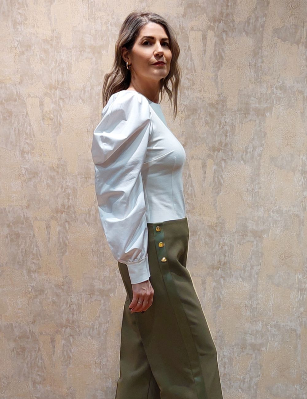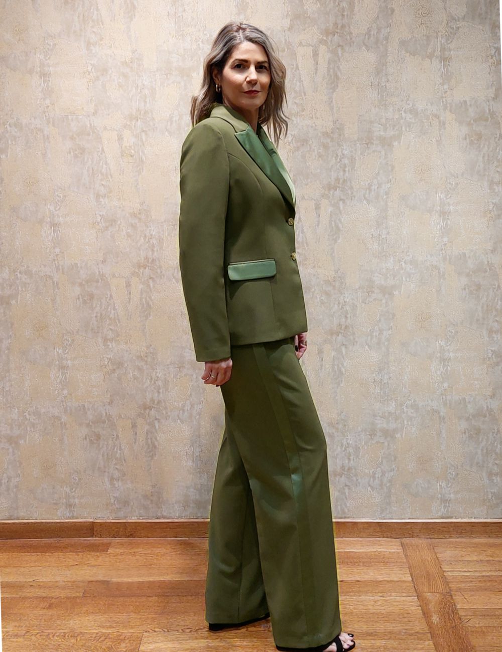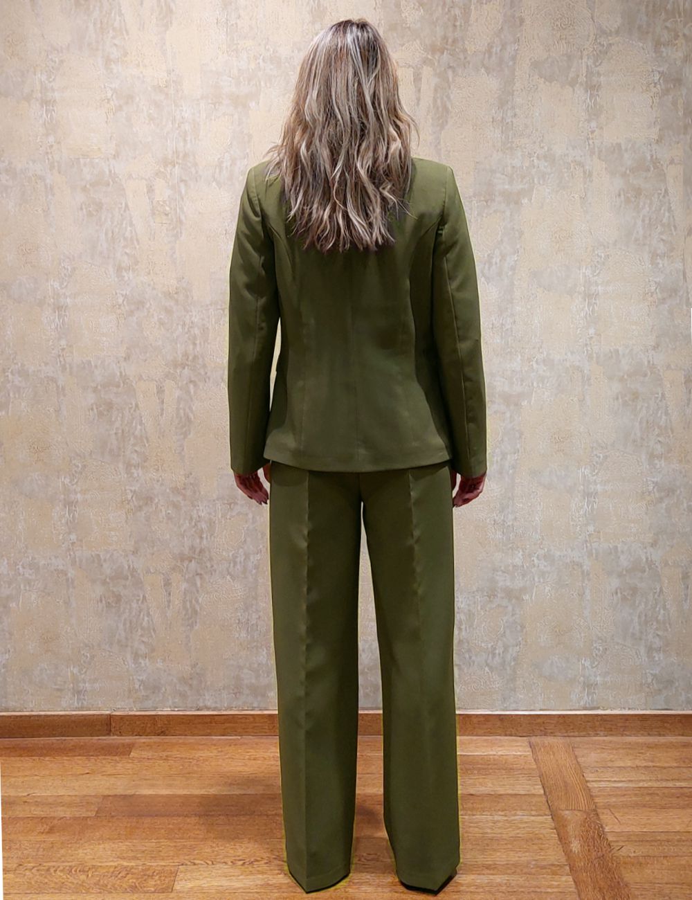 Κοστούμι σετ σε πράσινο λαδί χρώμα, δίκουμπο , εξαιρετικής ραφής με παντελόνι σε ίσια γραμμή και πλαϊνά διακοσμητικά κουμπιά