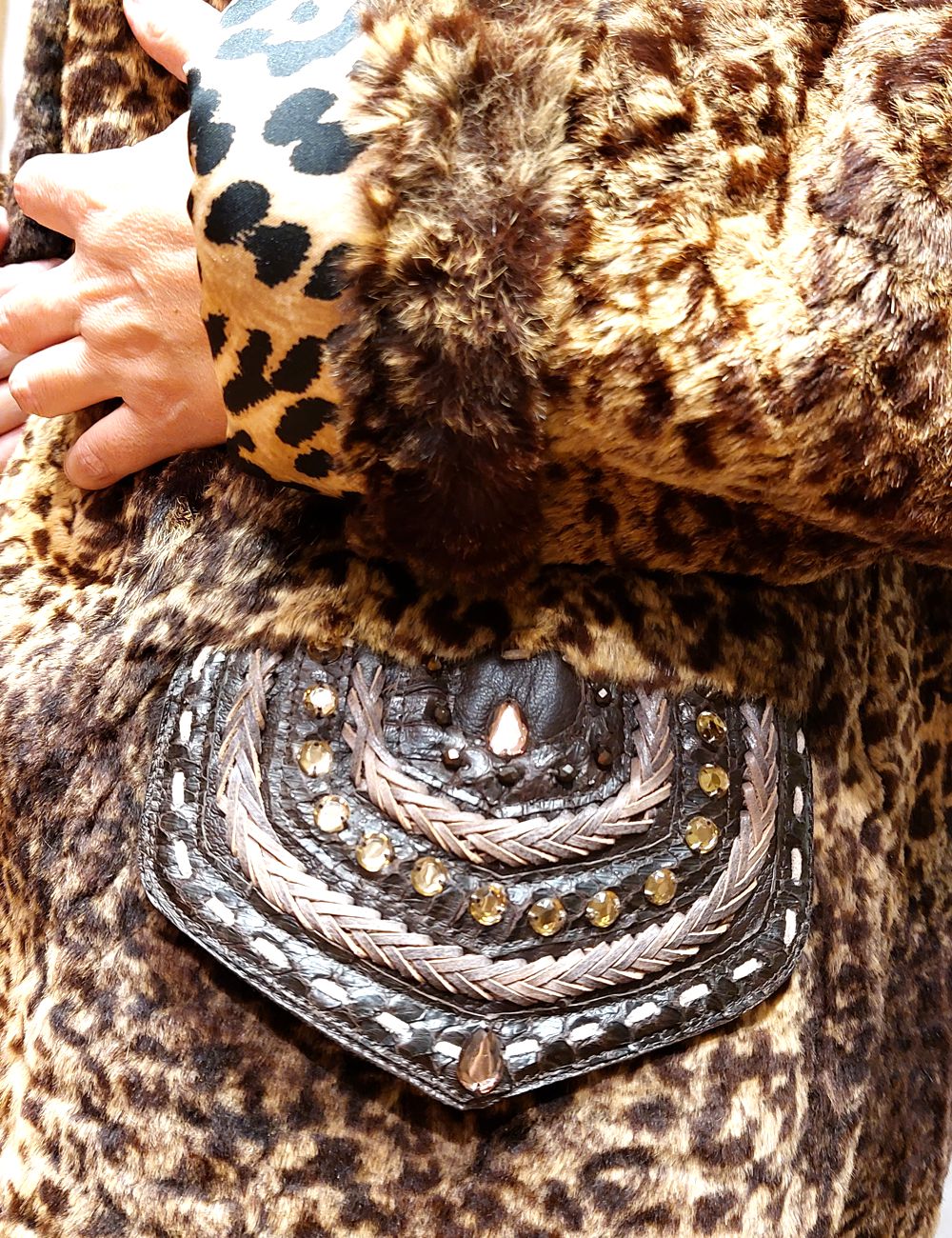 Με εντυπωσιακές δερμάτινες κεντημένες εξωτερικές τσέπες και φόδρα λεοπάρ.