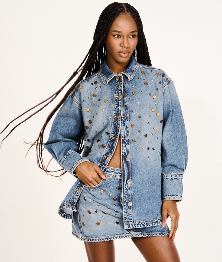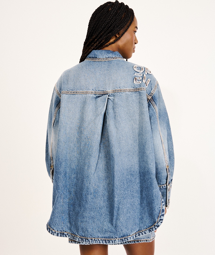 Πουκάμισο τζιν που μπορεί να φορεθεί και σας πανωφόρι γιατί είναι φαρδύ και άνετο. Τα διακοσμητικά τρουκ και τα γαζάκια το κάνουν πολύ ιδιαίτερο και μπορεί να συνδυαστεί ωραία με ότι θέλετε.